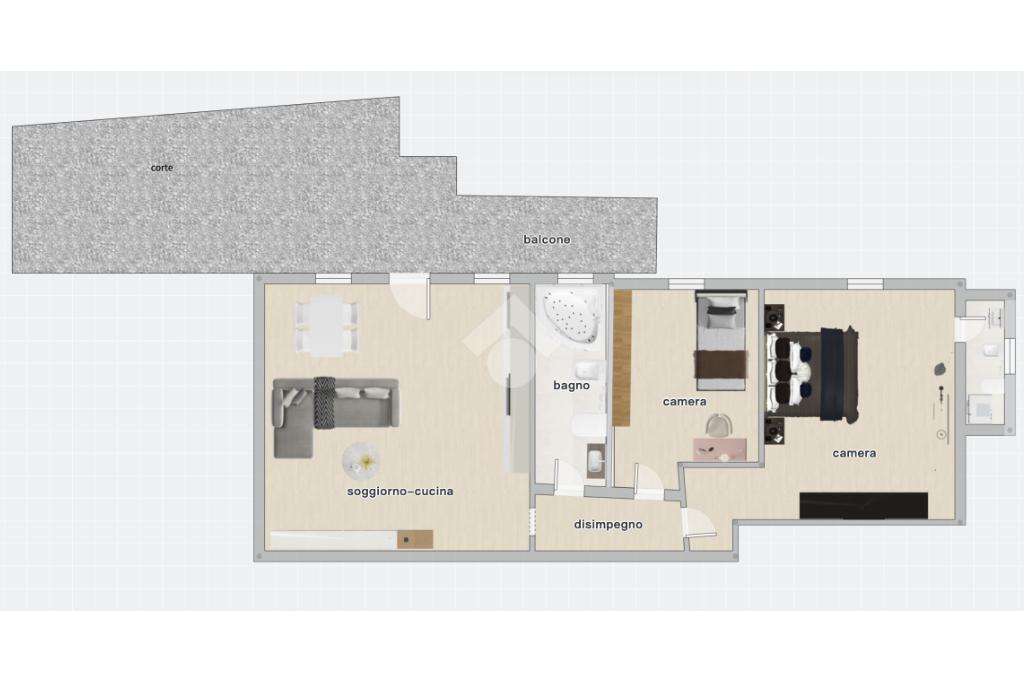 La soluzione è completata da corte, balcone, posto auto privato e ampio garage di circa 50 mq, ideale sia come secondo posto auto che come ripostiglio.